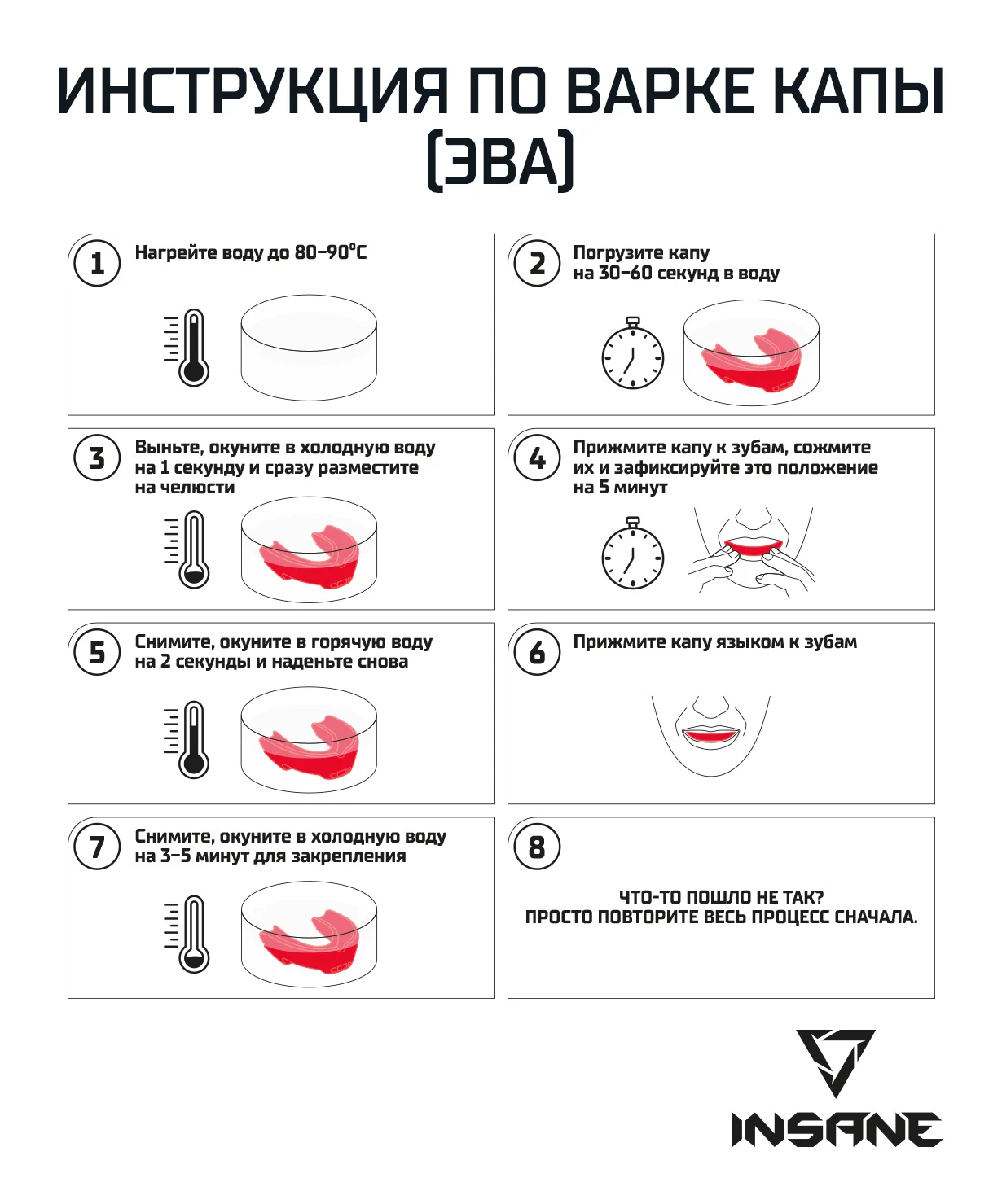 Одночелюстная капа LION от бренда INSANE - обязательный атрибут для защиты зубов и десен спортсмена, участвующего в спаррингах. Прозрачное изделие выполнено из прочного ударопоглощающего EVA (этилвинилацетат). Свойства материала обеспечивают максимальную надежность аксессуара, а физические свойства изделия гарантируют легкость дыхания и комфорт во время тренировок и спаррингов: капа термопластична и не требует долгой варки. Достаточно 45 секунд, чтобы она приобрела индивидуальную, идеально подходящую для челюсти взрослого спортсмена форму.