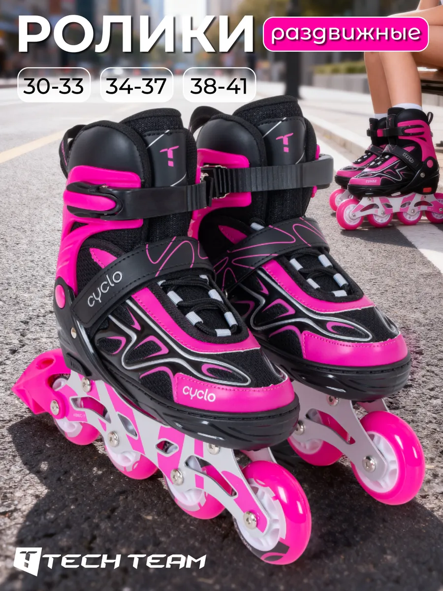Ролики для девочки детские раздвижные Cyclo (Сайкл) от компании TechTeam. Удобная колодка обеспечивает оптимальный комфорт, необходимый для продолжительного катания. Верх ботинка изготовлен из высококачественных износостойких материалов, обеспечивающих длительный срок эксплуатации. Благодаря раздвижному механизму вы можете изменить размер ботинка точно по растущей ноге ребенка. Надежная многосоставная система фиксации позволяет плотно зафиксировать стопу во избежание вывихов и повреждений. Ролики для девочки с алюминиевой рамой в паре с колесами из износостойкого полиуретана прослужат верой и правдой не один сезон. Промышленные подшипники обеспечивают прекрасный накат и устойчивы к ударным нагрузкам.