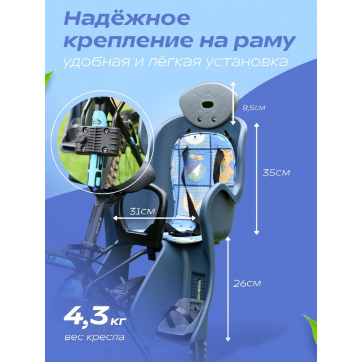 Велосипедное кресло для детей YC-800, для установки назад на подседельную трубу с помощью металлической дуги, с удобной рукояткой, ремнями безопасности. В комплекте регулируемые по высоте подставки для ног, мягкая подкладка.