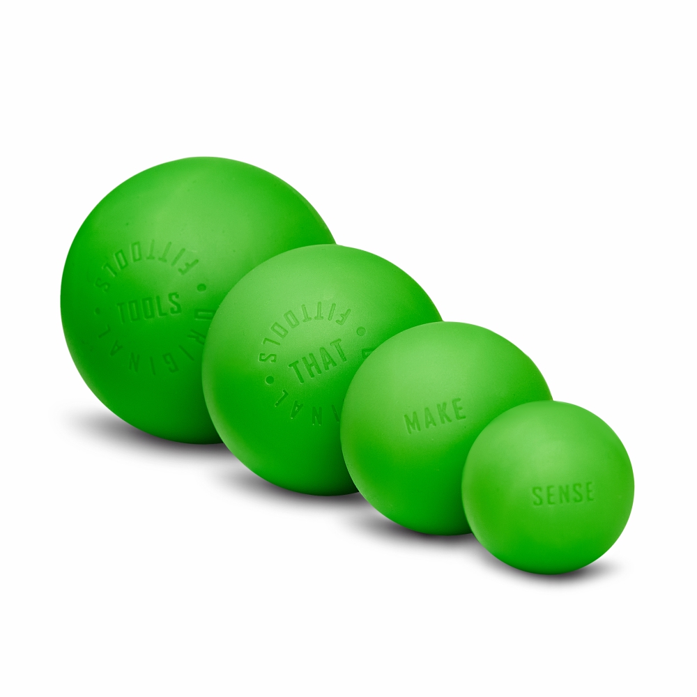 - Вес мячей OFT: 147 г (6,3 см), 74 г (5 см), 37 г (4 см) и 16 г (3 см) — весовая разница отражает плотность и прочность каждого массажного мяча.