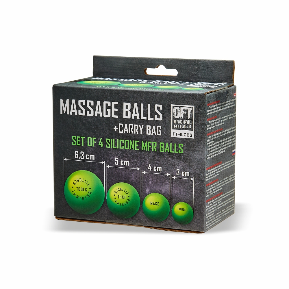 Этот набор включает в себя четыре массажных мяча разных диаметров: 6,3 см, 5 см, 4 см и 3 см. Массажные мячи изготовлены из высококачественного литого силикона. Каждый мяч из комплекта уникален по размеру и предназначен для эффективной и разнообразной проработки мышц и фасций тела. Мячи надежно удерживаются телом и не выскальзывают во время применения.