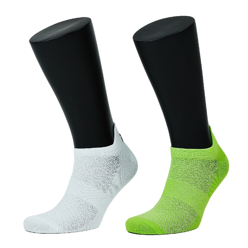 Выполнены из технологичного полиамидного волокна с добавлением эластана, что обеспечивает умеренную поддержку и быстрый отвод влаги при интенсивных нагрузках. Усиленные мысок и пятка делают изделие износостойким, а специальный язычок надежно защищает от натирания в области ахиллова сухожилия. Плетение в верхней части работает как естественная вентиляция, не позволяя стопе перегреваться.