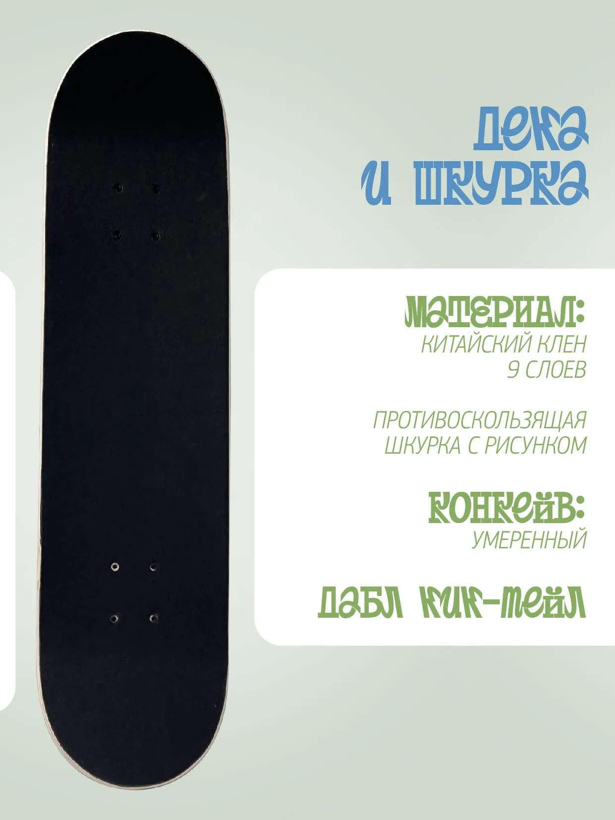 Прочная дека 31”х8” (79 см х 20 см) из 9-ти слоёв клёна китайских пород обладает высокой упругостью, низким весом и отличной реакцией. Её профиль не слишком агрессивен, кик-тейлы и конкейв имеют умеренный (средний) профиль, что делает эту деку простой и понятной в освоении, так как она может прощать некоторые ошибки новичкам.